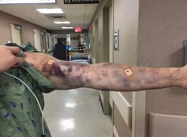 才過沒幾小時,他的手臂竟然出現一塊一塊的瘀青,而且疼痛到無法忍受!