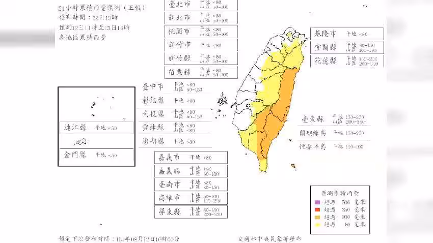 最新一波風雨預報顯示,明天下午前,高雄市山區以及台東縣山區的24小時累積雨量將突破停班課標準。