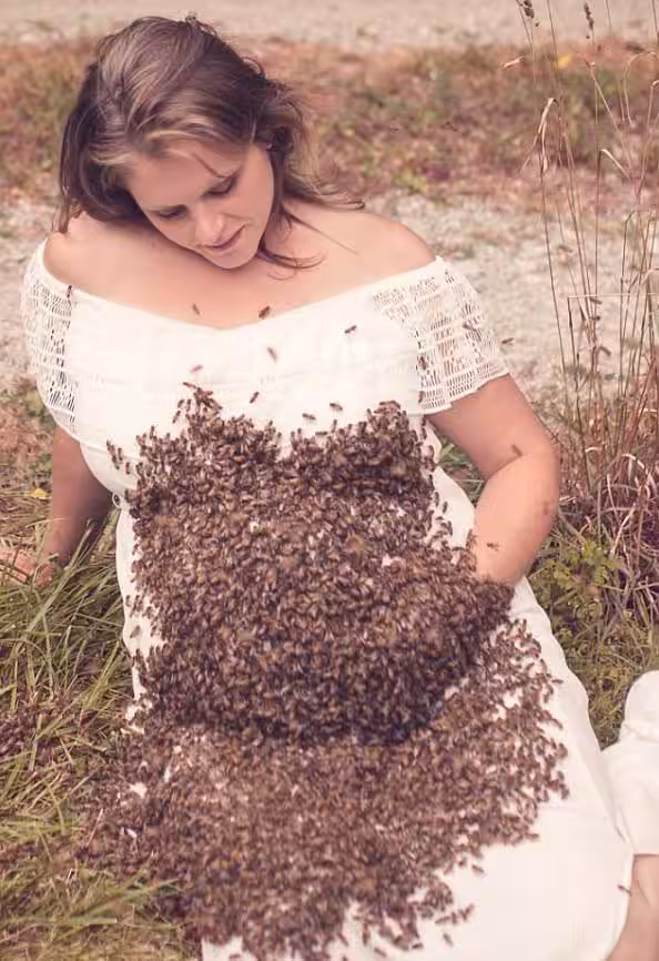 拍攝過程中,2萬隻蜜蜂安然地停留在她的肚皮上,她也只被輕輕螫了三次,且未曾觸及肚子。