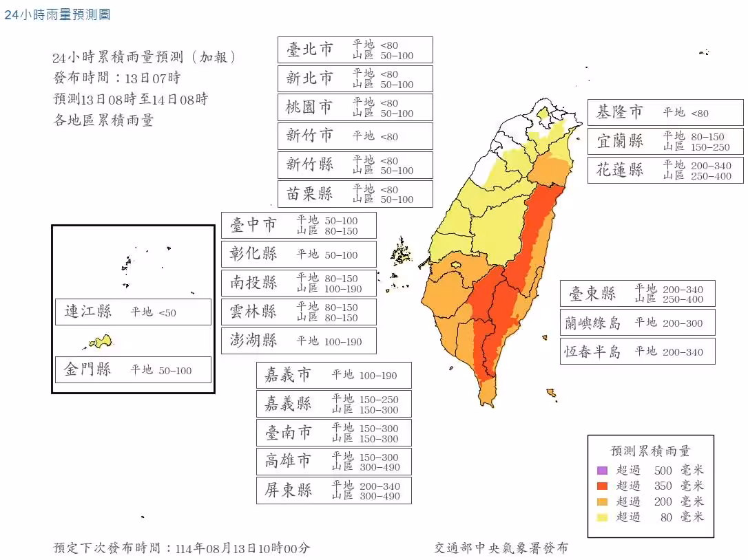 氣象署今晨7時公布最新降雨預測,今日8時至明日8時,嘉義縣山區150至300毫米;高雄市平地150到300毫米、山區300到490毫米;屏東縣山區300到490毫米;花蓮縣山區250到400毫米;台東縣山區250到400毫米,共計5縣市雨量達停止上班上課標準。