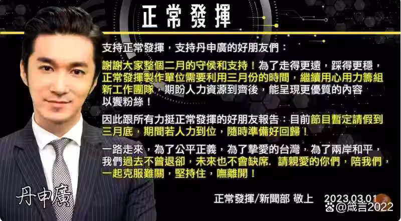 而原預計三月初復播的《正常發揮》,三月一日在粉專又公告,節目將停播至3月底,「期間若人力到位,隨時準備好回歸」!