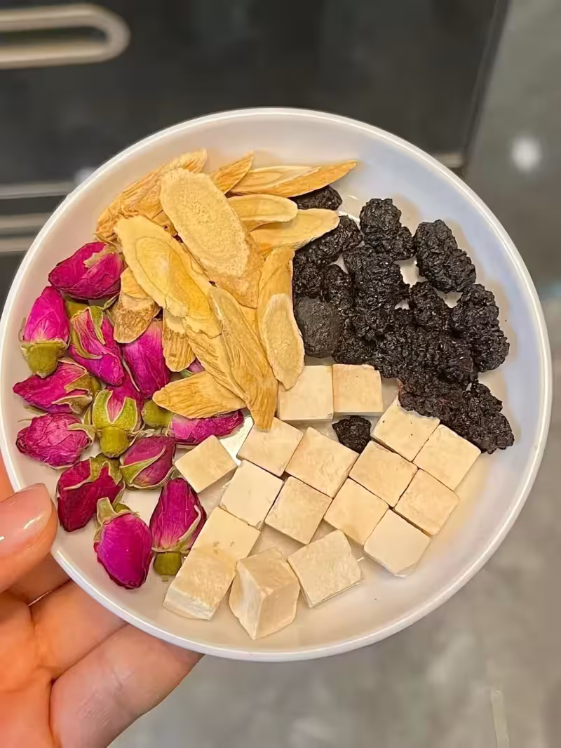 桑葚一小把、干玫瑰花十來朵、黃芪幾片、茯苓幾顆。