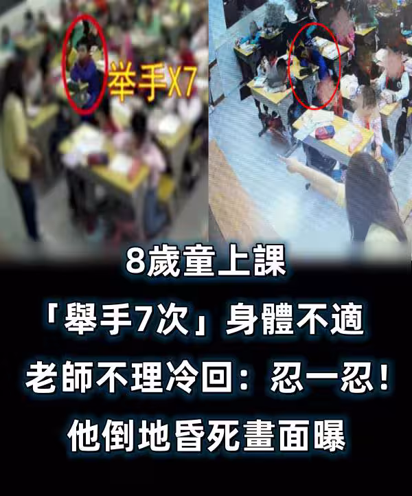 8歲童上課「舉手7次」身體不適 老師不理冷回:忍一忍!他倒地昏死畫面曝!