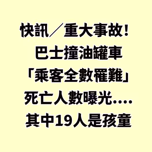 快訊/重大事故!巴士撞油罐車「乘客全數罹難」死亡人數曝光....其中19人是孩童