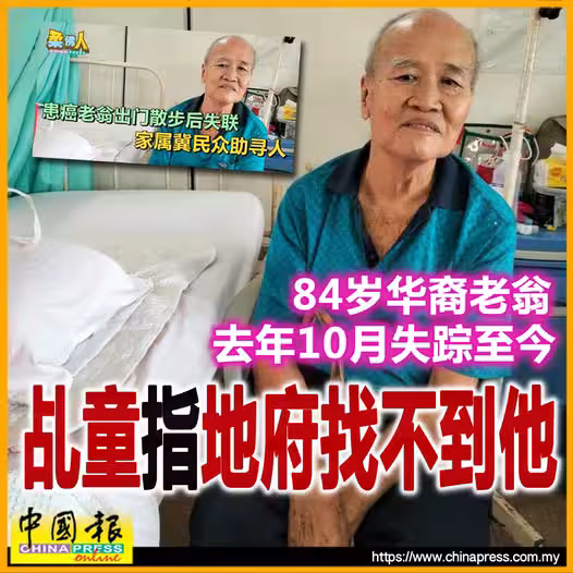 (古來23日訊)自去年10月失蹤,至今下落不明的84歲華裔老翁,經神廟乩童指點老翁在「地府中」找不到並尚在人間,其家屬抱著一線希望,並呼籲公眾協助尋人。