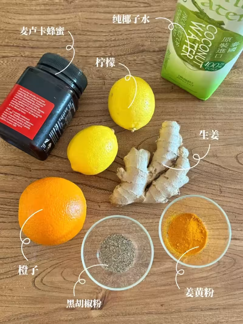 橙子取果肉,檸檬擠出汁,和椰子水、麥片一起用料理機打勻。最後加入薑黃粉和一點黑胡椒粉,輕輕攪拌就可以。