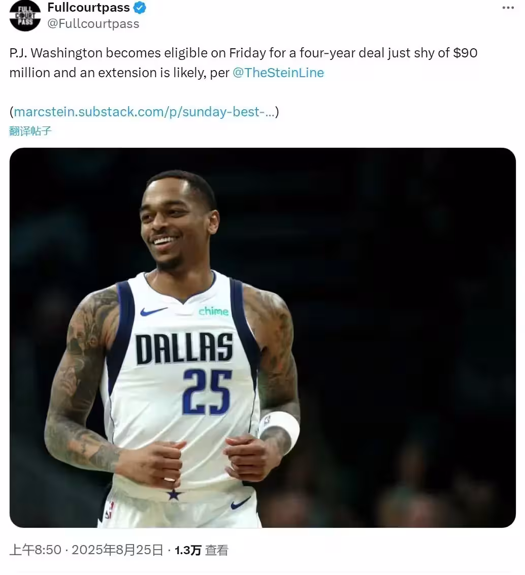 8月25日,NBA名記Marc Stein報道,當地時間本周五(29日)起,PJ-華盛頓有資格和獨行俠提前續約,最多能簽下一份4年9000萬美元的合同。Marc Stein表示,獨行俠會跟PJ-華盛頓續約,畢竟有多支球隊在關注這位攻守兼備的球員。