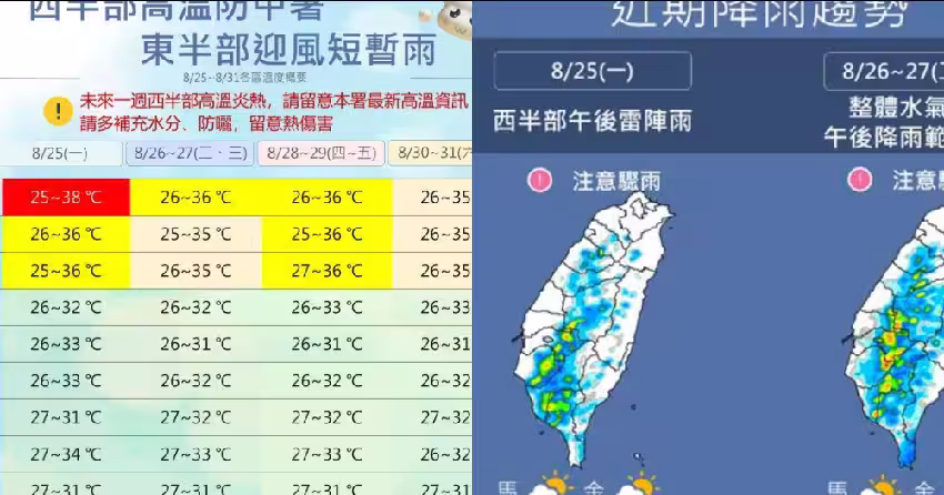 降雨部分,氣象署說,今天午後雷陣雨範圍主要在北部山區、中部山區,中南部地區尤其是嘉義以南也有可能,甚至會擴展到平地,斷斷續續出現短延時強降雨,明(25)日水汽增加,天氣不穩定,降雨範圍變廣,山區容易出現比較多的短延時強降雨機會。