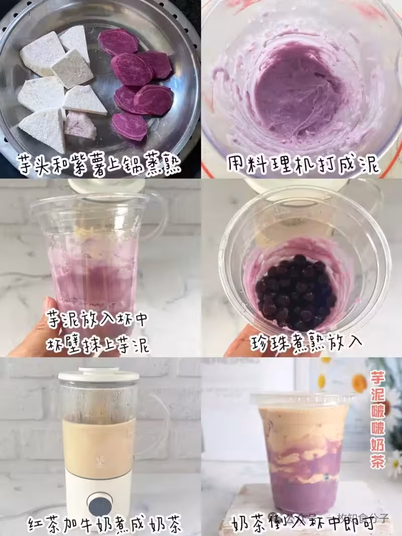 食材:芋頭50g|紫薯10g|珍珠30g|牛奶300ml|紅茶包2個|煉乳15g