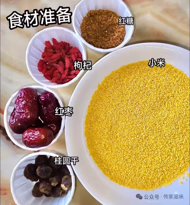 小米80g、紅棗5顆(去核)、桂圓乾10顆、紅糖1小塊(可選)