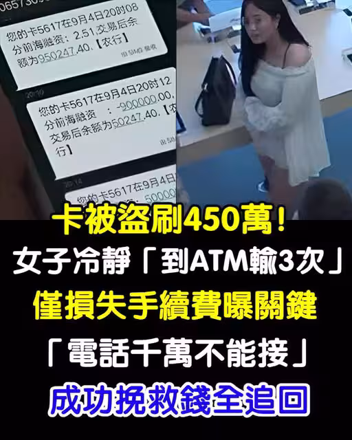 卡被盜刷450萬!!女子非常冷靜「跑ATM輸3次」只損失手續費,她曝關鍵「電話千萬不能接」成功挽救全追回