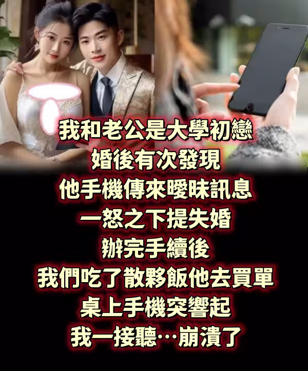我和老公是大學初戀,婚後有次發現他手機傳來曖昧訊息,一怒之下提失婚,辦完手續後,我們吃了散夥飯,他去買單,桌上手機突響起,我一接聽…崩潰了!!