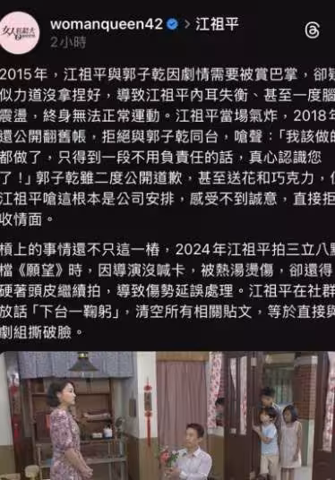 據《ETtoday星光雲》報導,《女人我最大》官方粉絲專頁日前發布一篇文章,內容提到江祖平曾在拍戲時遭到郭子乾意外打傷,造成腦震盪後遺症,無法從事正常運動。