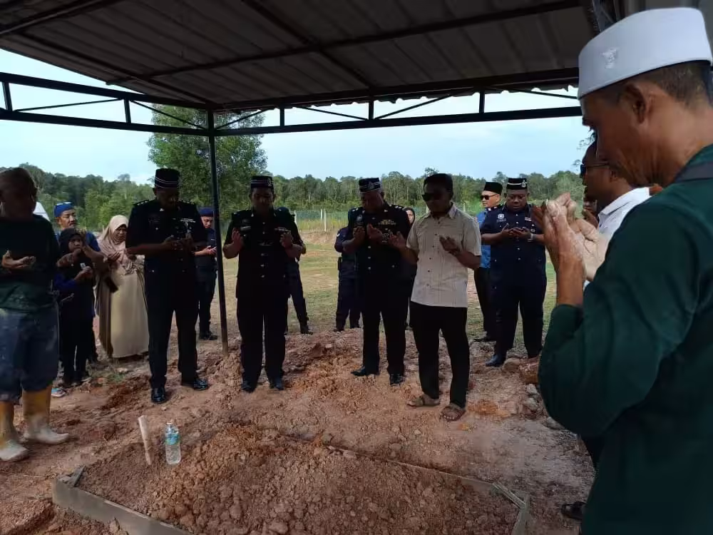 溺斃案兩名小死者終獲安葬,雖然沒有至親到場,卻有警方人員及熱心村民協助,前排左4為波德申警區主任馬斯蘭。
