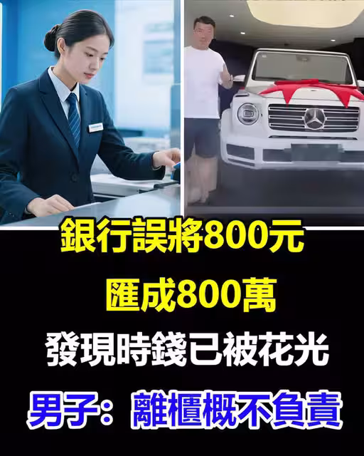 銀行誤將800元匯成「800萬」!發現時錢已被儲戶花光,男子:離櫃概不負責!