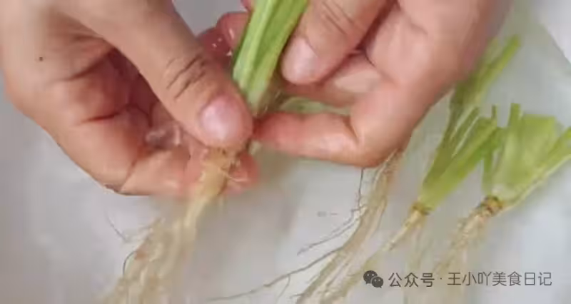 處理香菜根:香菜根剪掉鬚根,撒1勺鹽,加清水浸泡10分鐘(鹽能殺菌去泥),泡好後搓洗3遍,切成小段(切碎更易出味)。