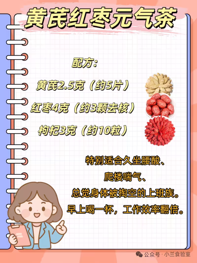 黃芪是補氣聖品,搭配紅棗養血安神。喝完整個人都元氣滿滿,特別適合久坐腰酸、爬樓喘氣、總覺身體被掏空的上班族。早上喝一杯,工作效率翻倍。