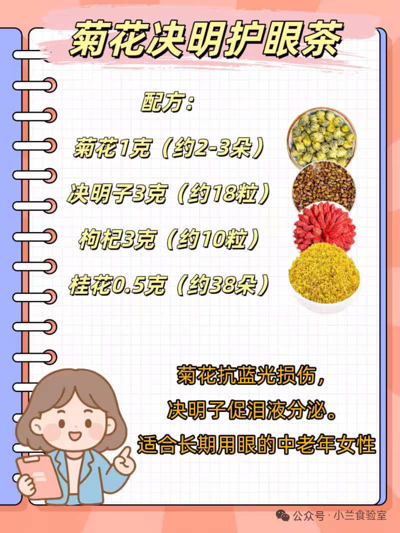 菊花抗藍光損傷,決明子促淚液分泌。適合長期用眼的中老年女性,對高血壓有輔助調節作用。配合20-20-20用眼法則,眼白會逐漸恢復瓷白色。