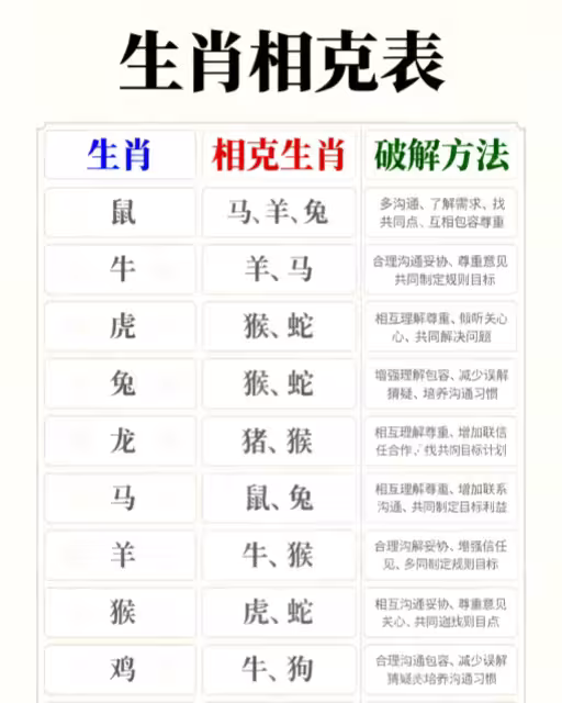 生肖相剋怎麼破?12生肖相剋表