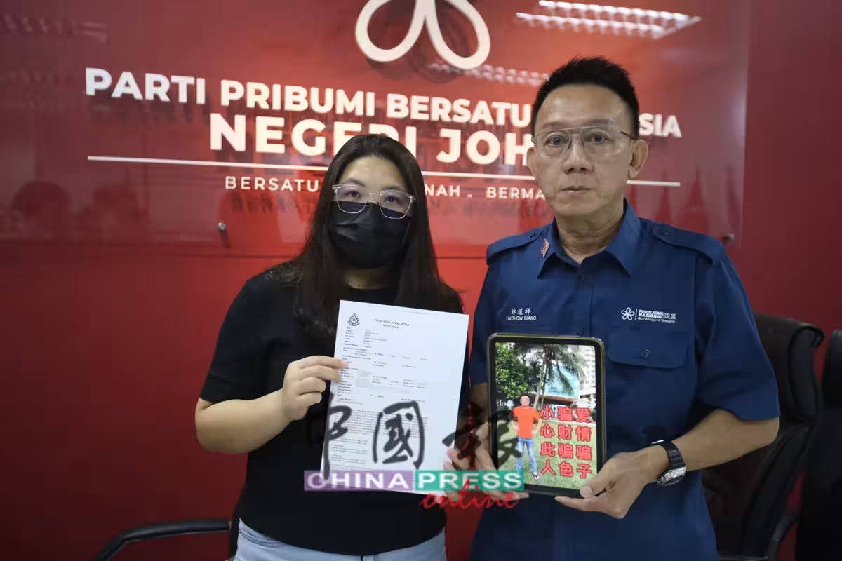 陳姓女子(左起)在林道祥陪同下召開記者會,並展示報案紙。
