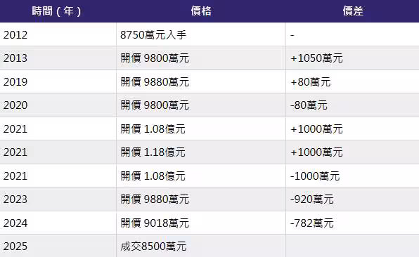 該物件自2013年起就開始掛網求售,期間經歷多次價格調整,從最高喊價1.18億元到最終8500萬元成交,總計167.29坪的豪宅,單價降至5字頭。