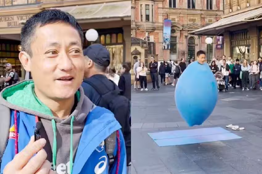 據外媒《9news》報導,他的表演形式是會先在地上鋪好一張瑜珈墊,並將全身塞入一顆充滿彈性的巨大氣球中,隨即將音樂打開,隨著節奏上下、左右彈動,圖/翻攝自9news其中又以當紅電子舞曲「Crazy Frog」的表演最為人熟知。