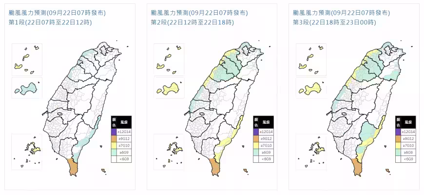另外,桃園市濱海鄉鎮、新竹市濱海鄉鎮、新竹縣濱海鄉鎮、苗栗縣濱海鄉鎮、台中市濱海鄉鎮、屏東縣恆春半島、台東縣濱海鄉鎮、蘭嶼、綠島、連江縣、金門縣、澎湖縣均可能出現7級以上平均風、10級以上陣風,同樣已達停班課標準。
