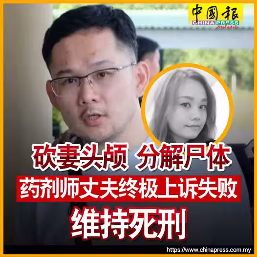 (古晉23日訊)7年前殘暴砍下中國籍妻子頭顱和肢解其身體的華裔前藥劑師黃敬浩,今早在聯邦法院上訴失敗,維持被判謀殺罪成和死刑的判刑。