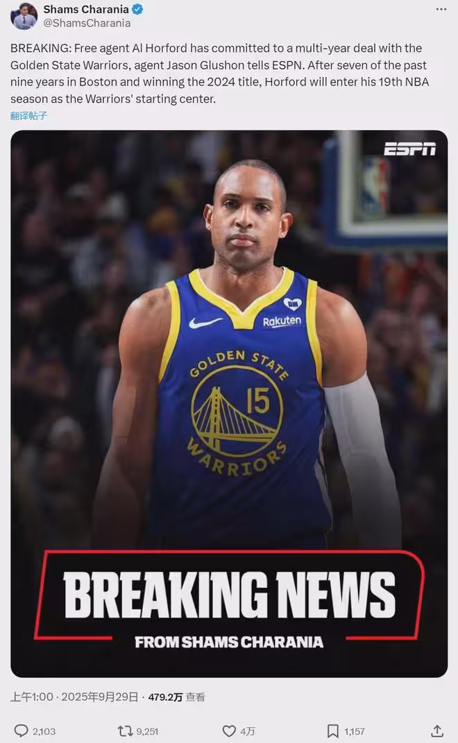 恭喜勇士!簽下多年合同!總冠軍中鋒正式加盟