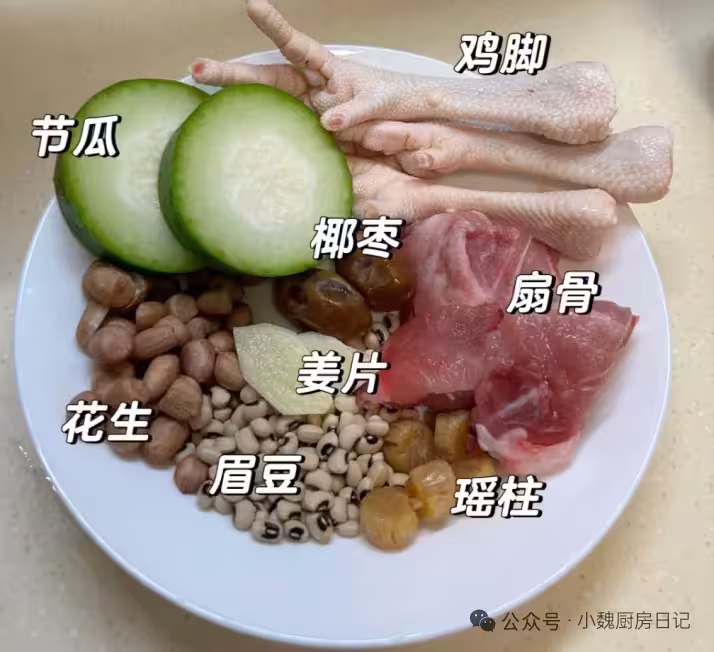 主料(4-6人份):選購新鮮雞爪5-8個(雞爪又叫鳳爪,雞爪的口感Q彈,雞爪要選擇個頭適中,色澤不要太白,雞爪可以做成各種美食,怎麼吃都好吃),豬骨300克(帶骨髓的更香),節瓜1個(約600克,選表皮帶絨毛的更嫩),眉豆50克(提前泡2小時,容易煮爛,眉豆與薏米的祛濕效果不錯,煲湯的時候可以加入一些),花生80克左右(花生要選擇個頭飽滿,表面乾燥的優質花生,花生需要提前泡發,這樣更容易煮爛),瑤柱50克,溫水少許,一大塊陳皮,生薑一大塊,食鹽少許,清水足量,溫水少許,2個椰棗,其他。