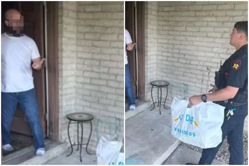 美國德州一名男子叫外送,不過正要應門取餐時,卻當場嚇到,因為外送員竟是名警察,事後才知道原本的外送員在送餐途中遭警方逮捕,警察則熱心地將餐點送到他家。