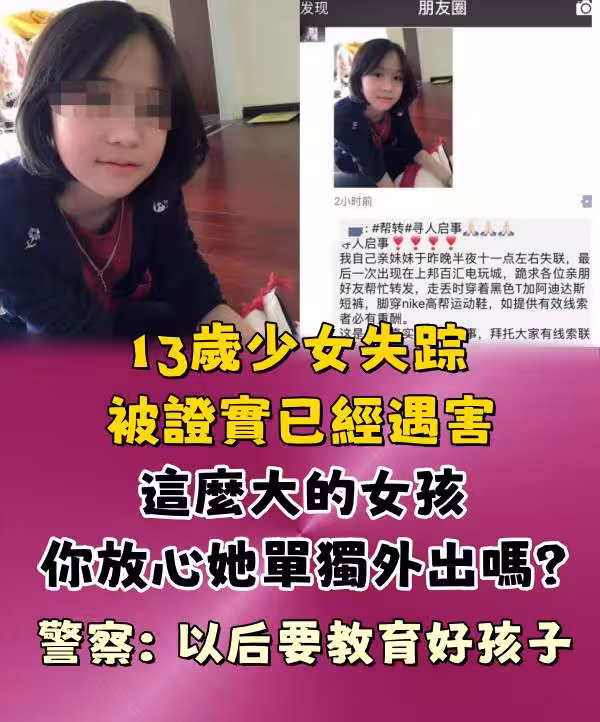 2018年3月30號,13歲的朱槿瑜下午的時候帶上手機和充電寶,被家裡人送到電玩城去玩耍!到晚上十一點都沒回家!