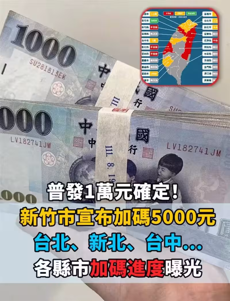 普發1萬元確定!新竹市宣布加碼5000元,台北、新北、台中...各縣市加碼進度曝光