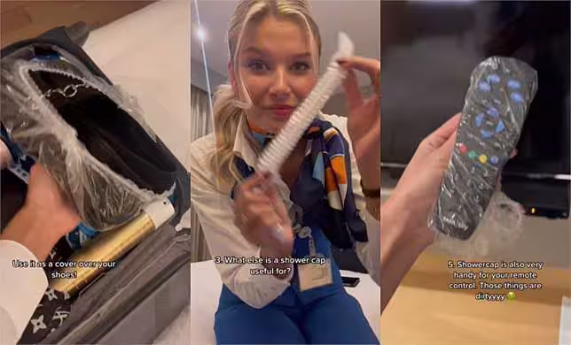 旅館附的浴帽可以拿來裝鞋子,也可以拿來包著遙控器當保護套,因為通常旅館的清潔人員都不會好好清理消毒遙控器,縫隙里其實非常髒!