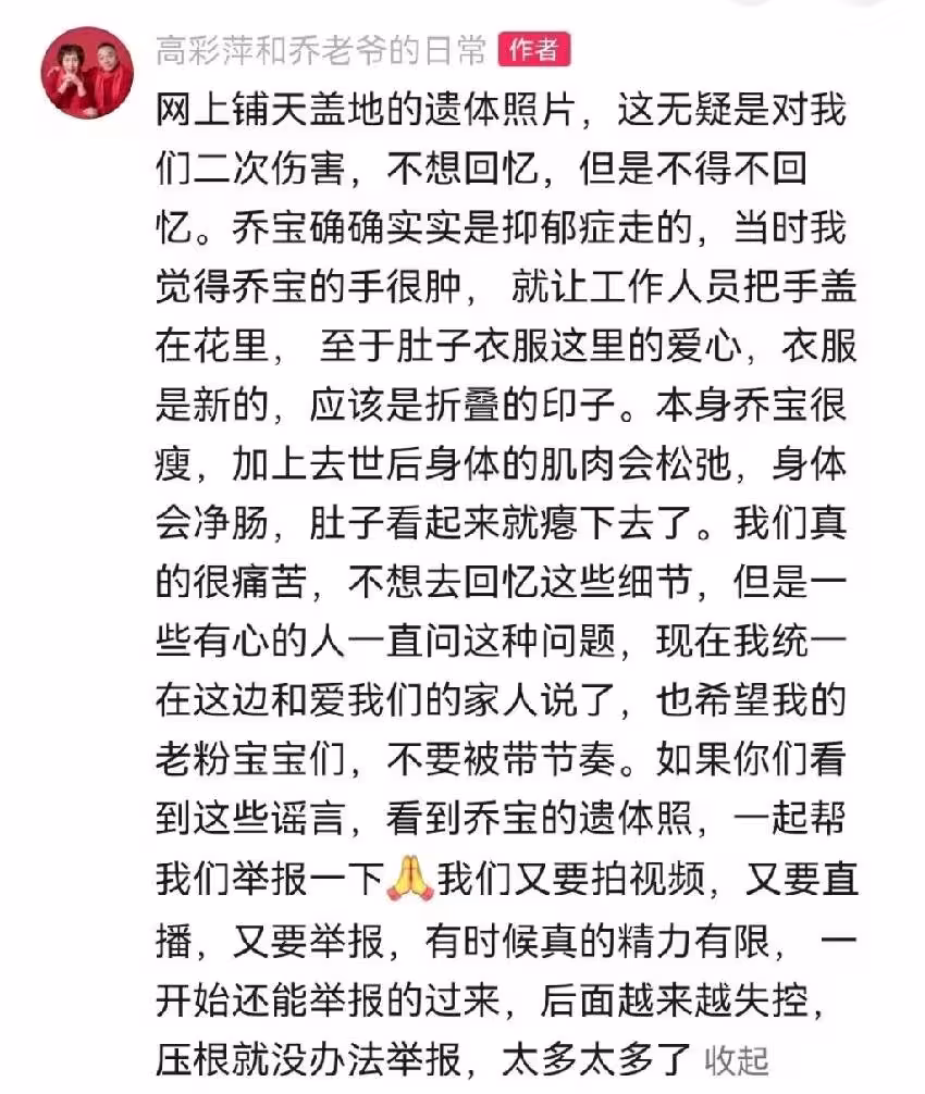 兩老期盼外界不要再散布喬任梁的遺體照,希望網友幫忙看到謠言或照片就立刻檢舉,不然場面可能會越來越失控。