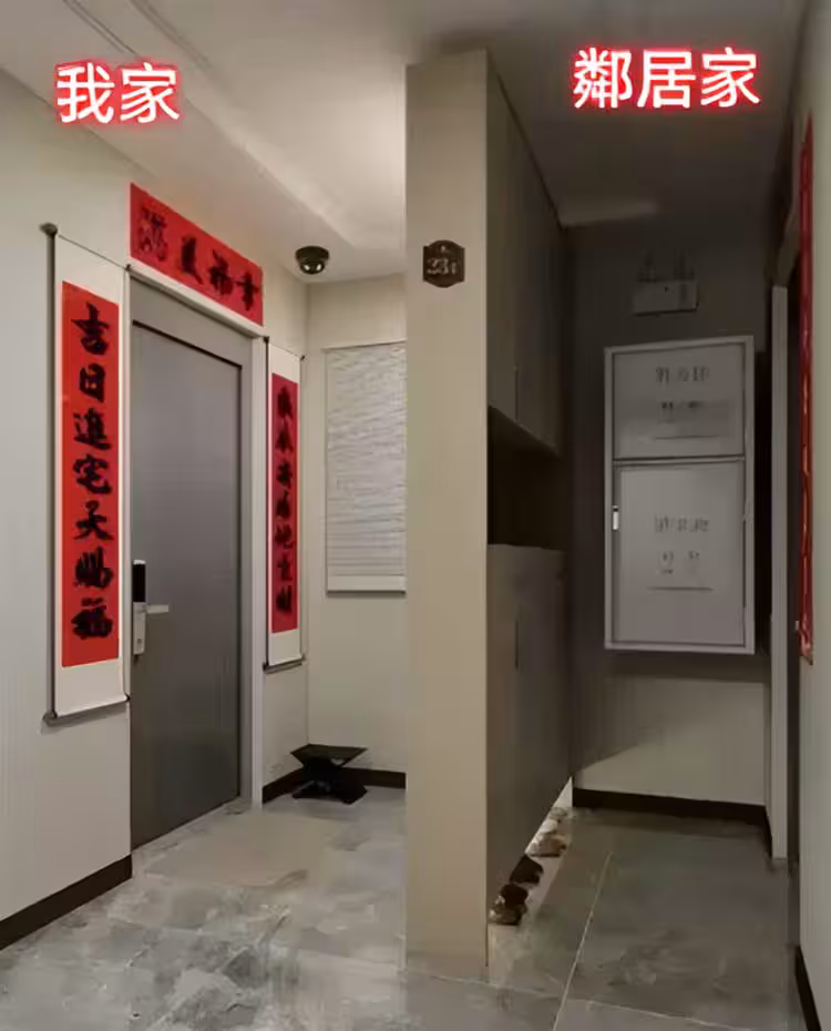 支持派認為鄰居行為合規:「隔離牆在他們那一半,沒有占用你的區域」 ​​,並指出「公攤面積也算錢的」,推測對方可能因「放門口隱私侵犯、不衛生」而採取合理措施·反制派派​​提出應對對策:​​「紅線位置裝個門,利用他家牆體多得一個玄關」​​形成「應對」 ·移動實際派?