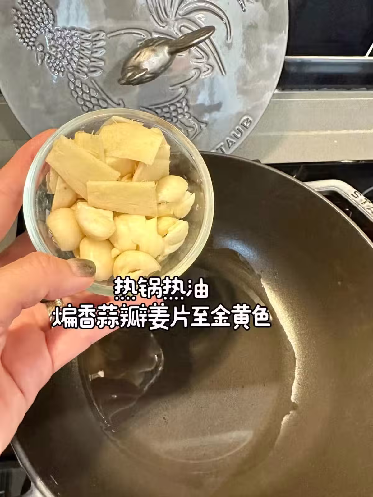 2)加入雞肉拌炒,加入少許香油/麻油炒香翻炒,加入適量醬油、蚝油、黑醬油/曬油、紹興花雕酒拌炒均勻。