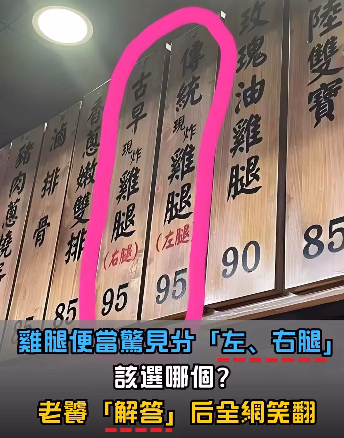一名網友日前到一家便當店買午餐,結果在點餐時被店裡的菜單給難住了。只見菜單上清楚寫著「傳統現炸雞腿(左腿)」和「古早現炸雞腿(右腿)」,價錢還一模一樣。他看了半天,忍不住問老闆:「這是要怎麼選?左腿跟右腿吃起來有不一樣嗎?」