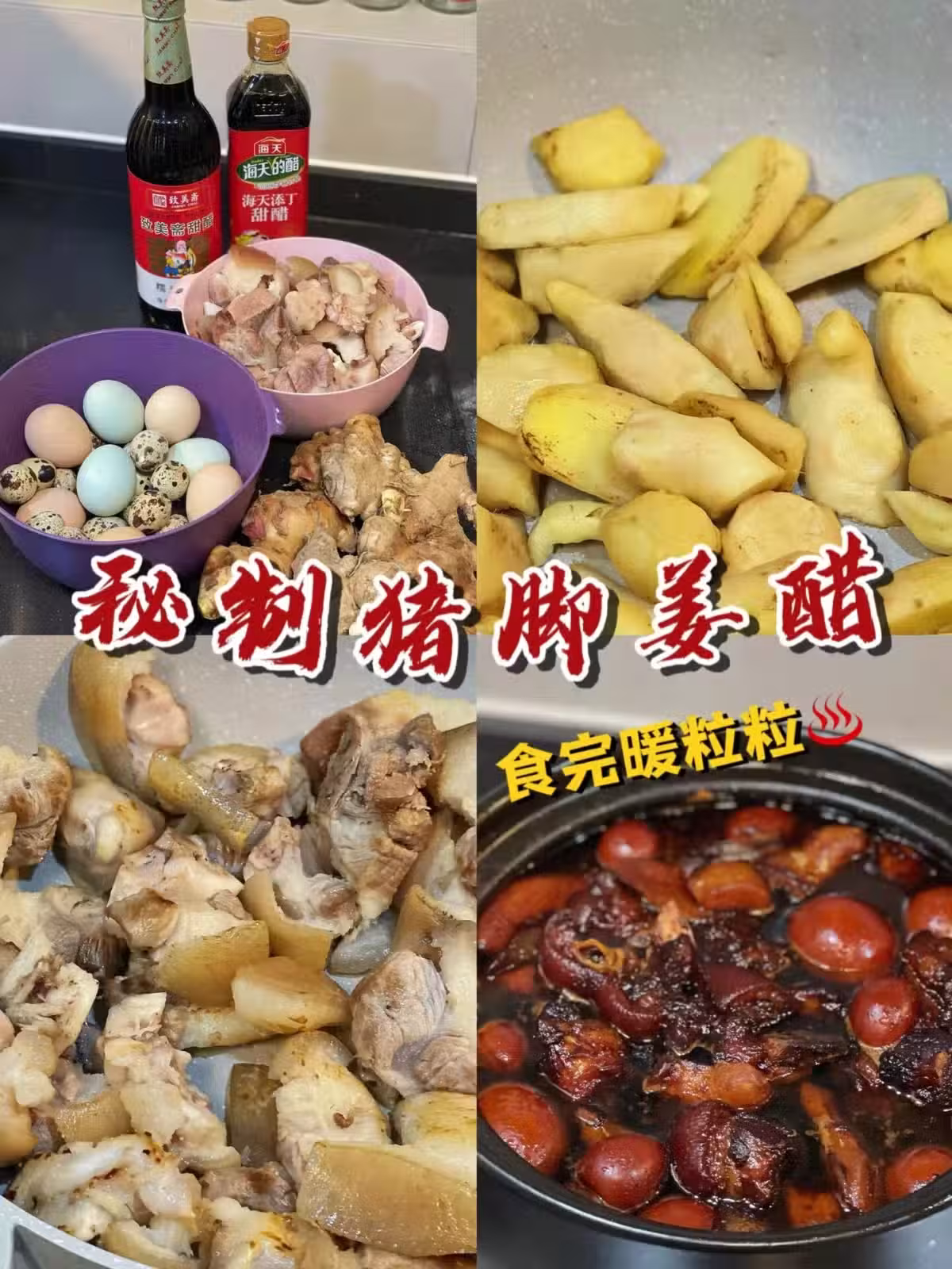 半隻豬手(豬手比較不肥膩)、老黃姜半斤(出辣味)、嫩黃姜半斤(口感好)、甜醋兩種(致美齋偏甜、海天偏酸)、雞蛋8個、鵪鶉蛋20個(鵪鶉蛋可以多加!超好吃的!)、還有最重要的半塊黃片糖‼️