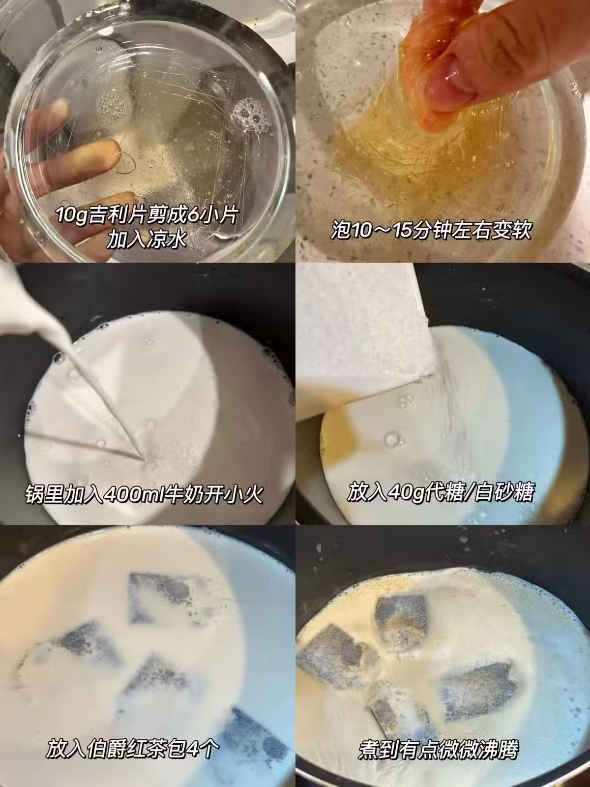 ✅過濾茶包,倒入淡奶油後放入吉利片攪拌至完全融化;