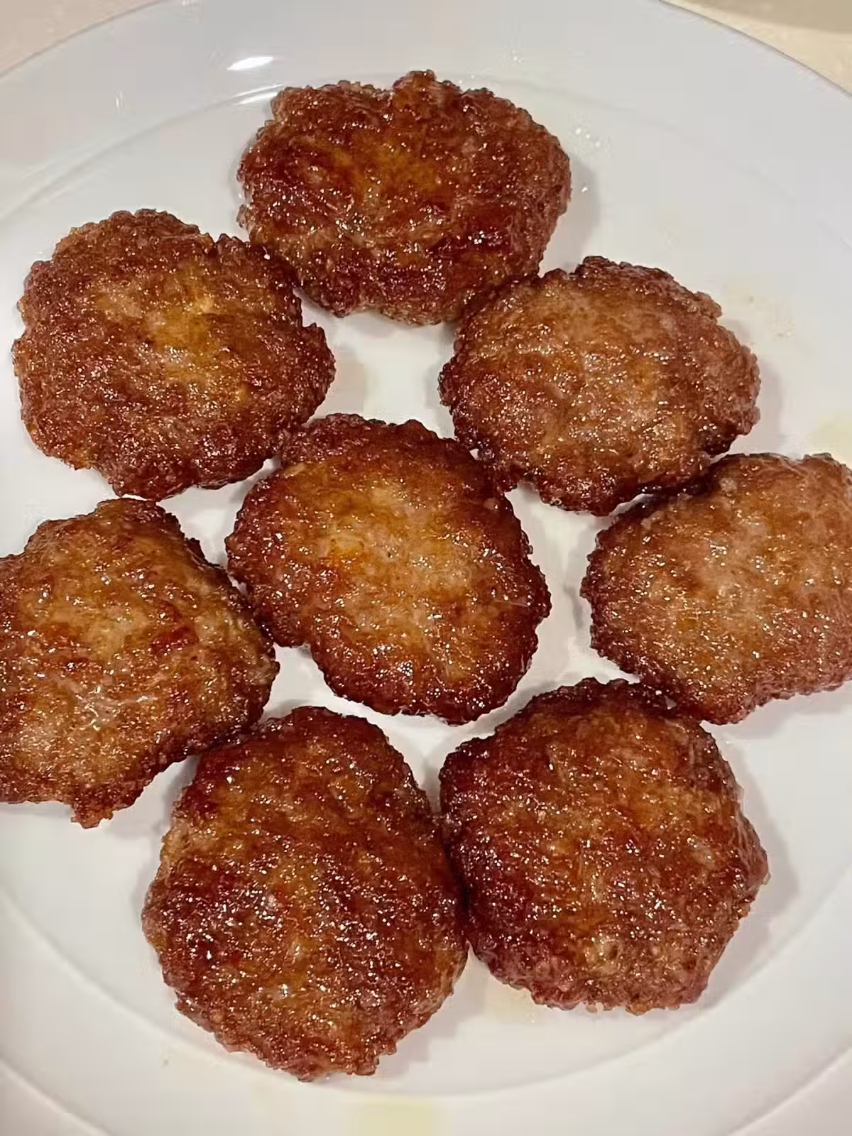 2。搓成小圓球再按壓扁,熱鍋冷油放入蒜和肉餅中火慢煎至兩面金黃即可.