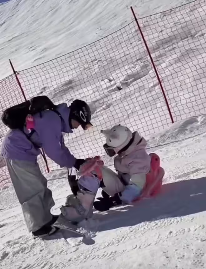 很快全紅嬋就上手了,可以自己自由的滑行了。只能說全寶本身就有很強的運動天賦,學滑雪也是那麼快。