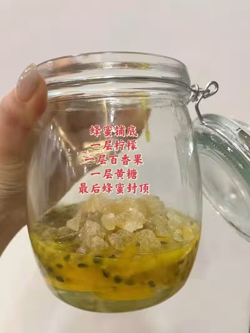 2️⃣無油無水的玻璃瓶中,蜂蜜鋪底+一層檸檬+一層百香果+一層黃糖+一層檸檬+一層百香果+一層黃糖…最後用蜂蜜把食材都蓋住封頂
