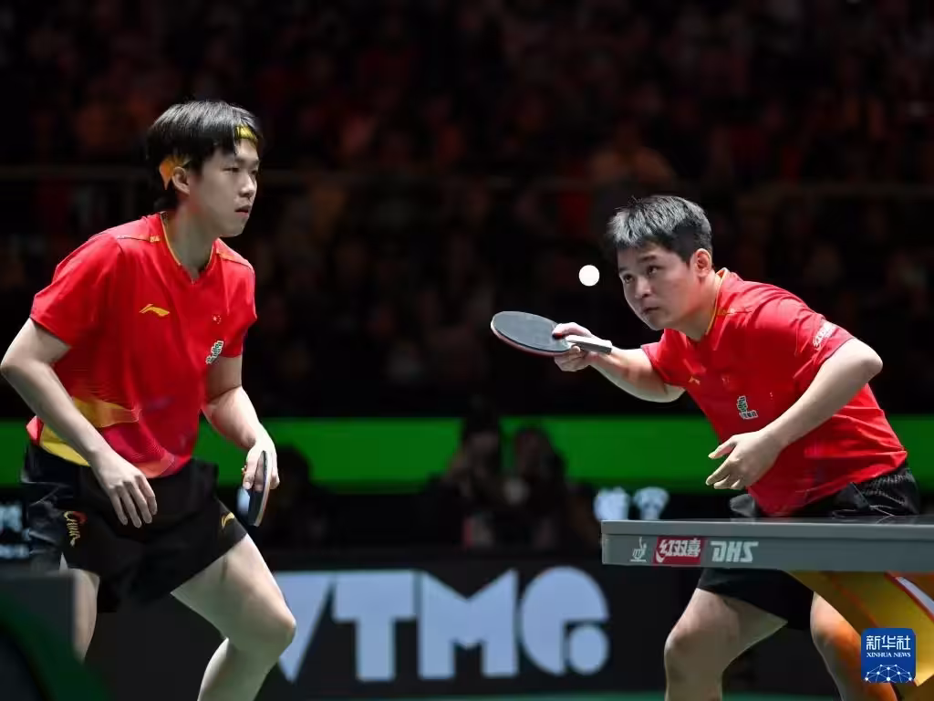 12月4日,中國隊組合王楚欽/林詩棟(右)在男雙比賽中。他們1比0戰勝法國隊組合艾利克斯·勒布倫/費利克斯·勒布倫。