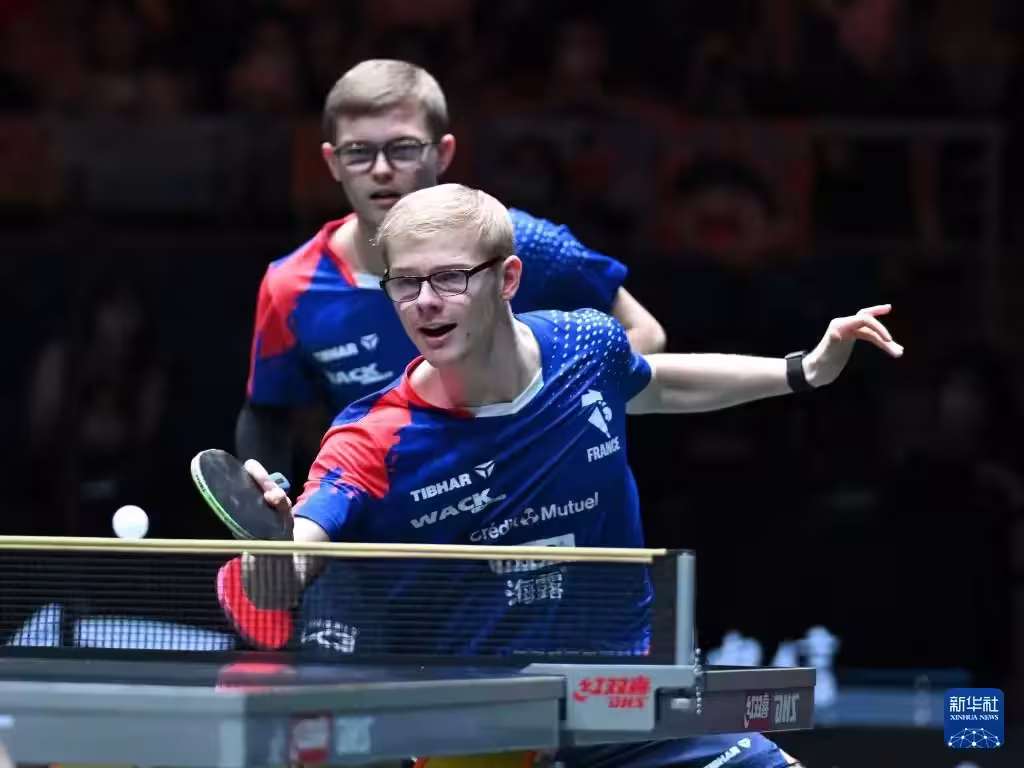 12月4日,法國隊組合艾利克斯·勒布倫/費利克斯·勒布倫(右)在男雙比賽中。他們0比1不敵中國隊組合王楚欽/林詩棟。