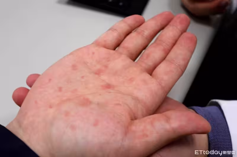 蘇信豪表示,梅毒被稱為醫學界的「偉大的模仿者(The Great Imitator)」,是因為它的症狀千變萬化,常常偽裝成皮膚病。以手掌紅斑,是二期梅毒最典型的特徵之一: