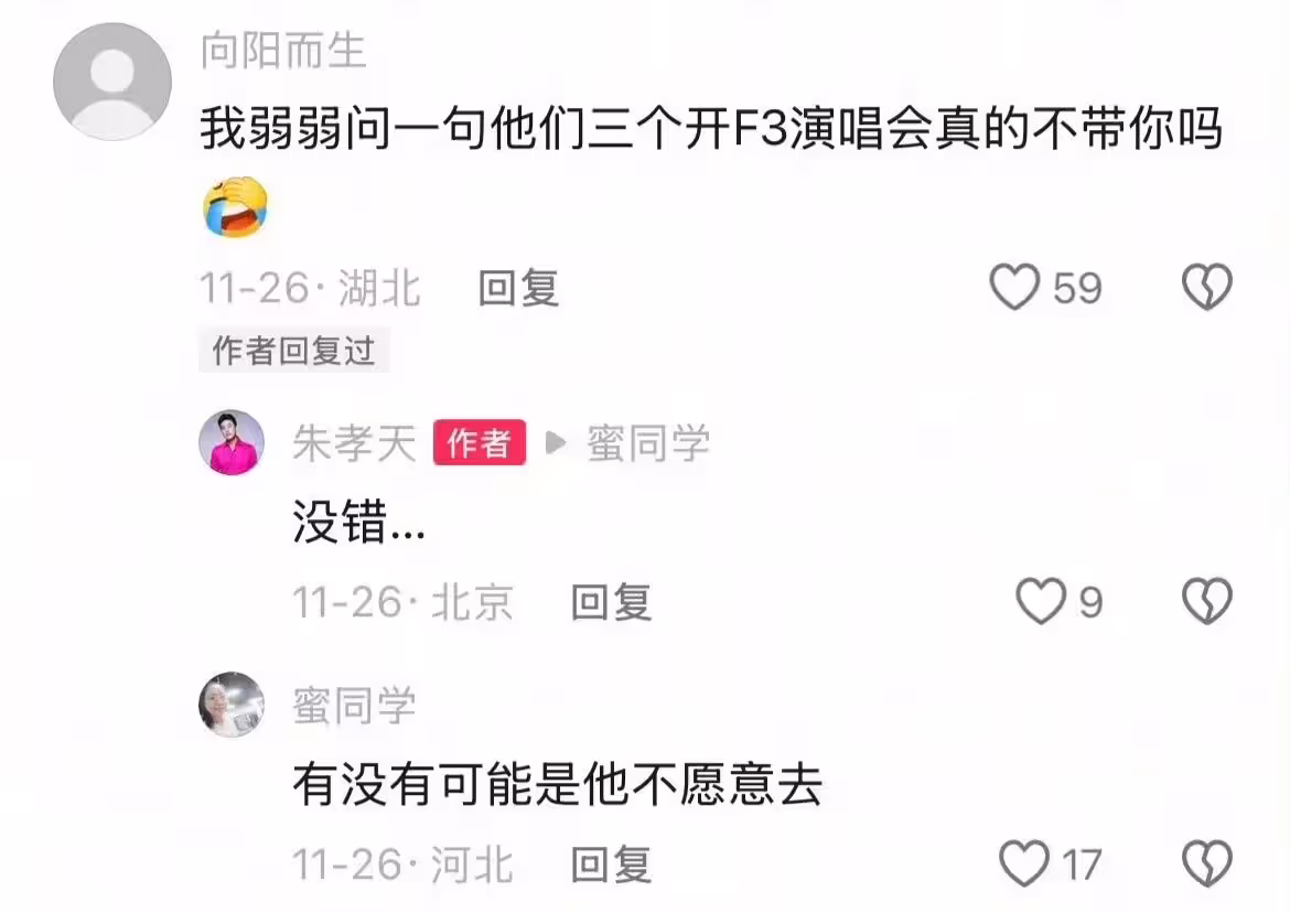 事實上先前朱孝天就曾在直播中表示,謝芝芬和五月天阿信兩年前就曾想要找F4合體,還親自出馬說服朱孝天多次;阿信前天開直播,也透露謝芝芬這些日子為了促成4人合體,搭飛機的里程數多到足以繞地球兩圈,更直言:「接下來還是不會放棄任何機會,呈現給大家最想看的所謂的最完整的陣容。」當時朱孝天說的多熱血,如今卻反過來狠咬相信音樂,讓許多粉絲無法接受。
