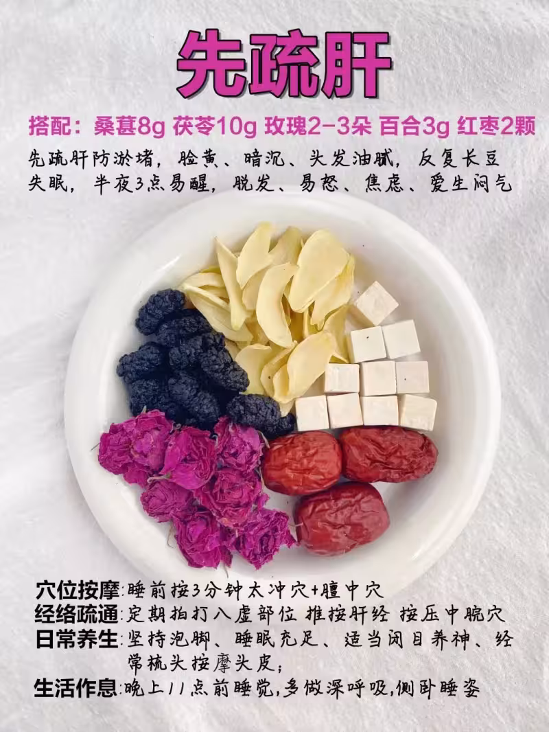 先疏肝 肝氣鬱結,入睡困難,還總愛發脾氣。肝氣鬱結影響脾胃運化,時間久了肝鬱脾虛,肝鬱化火。睡不好,也很內耗。