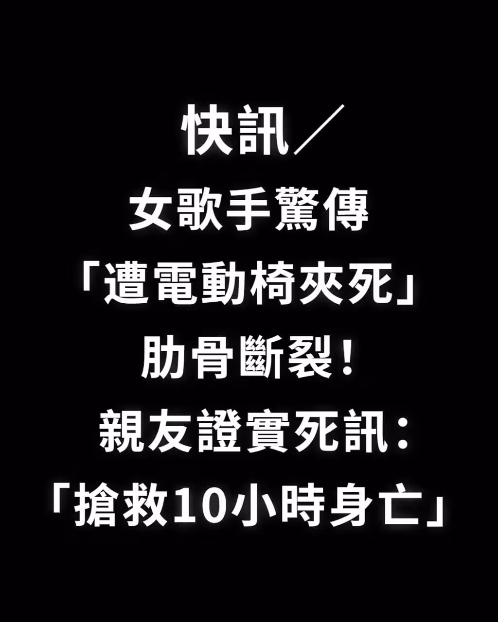 快訊/ 女歌手驚傳「遭電動椅夾死」肋骨斷裂!!! 親友證實死訊:「搶救10小時身亡」