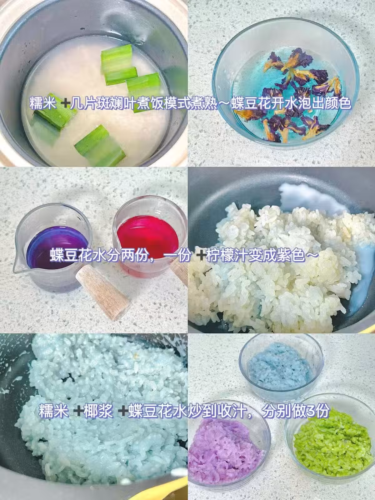 3️⃣煮熟的糯米飯分3份,加兩勺椰漿,分別➕蝶豆花水/斑斕精華炒到收汁備用 椰奶👩‍🍳製作方法🔍 所需食材炒到粘稠即可 台式椰汁芒果🥭糯米飯 嘗試自己做了下 尊嘟好簡單‼️ 用💚天然食材調色 顏色也太好看啦🥳🥳 配上斑斕葉一起煮飯 味道也敲清新🍃🍃 仙女🧚‍♀️們可以安排起來啦✌️✌️